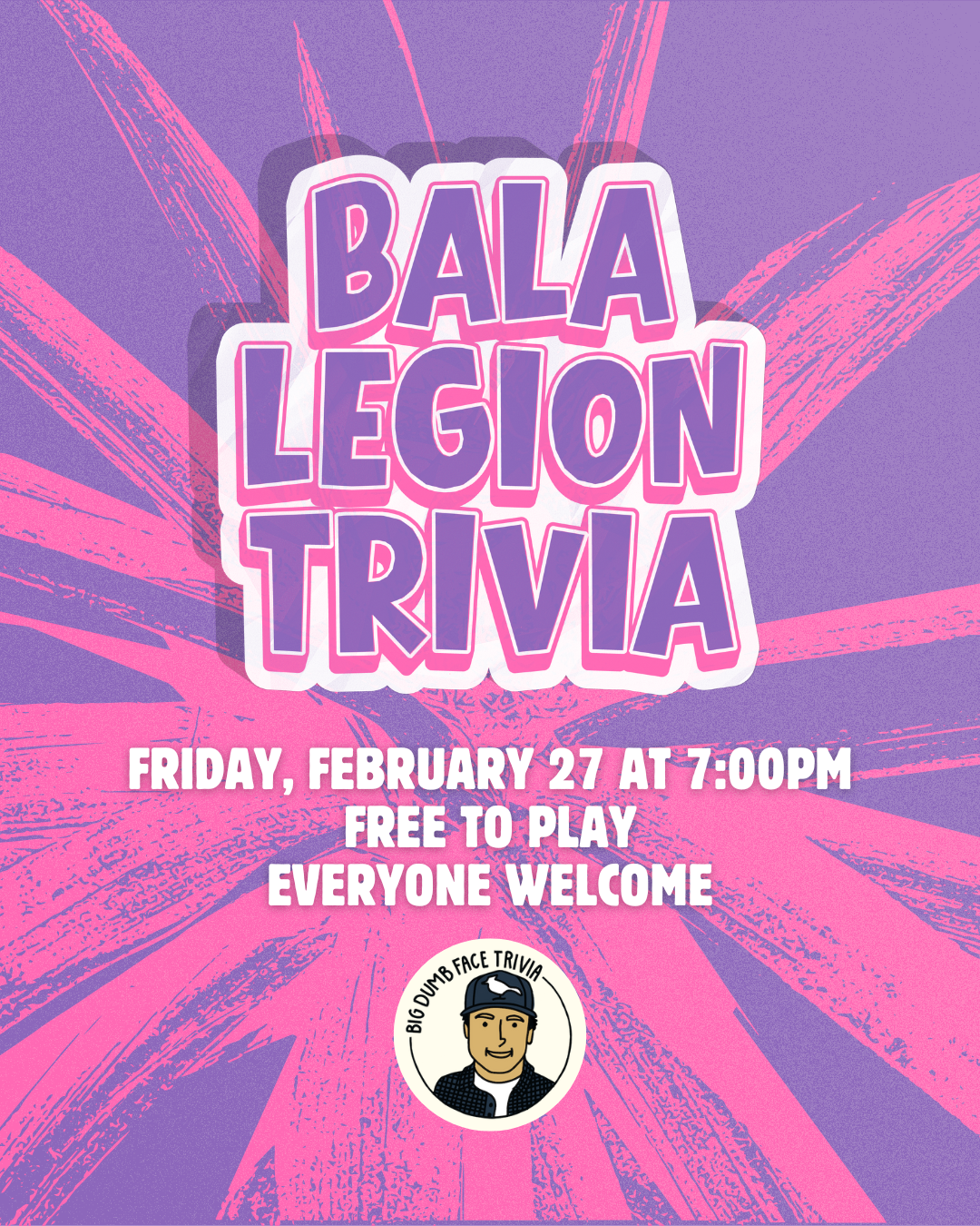 Back to All Events Bala Legion Trivia Night Friday, February 27, 2026 7:00 PM 9:00 PM Bala Legion 1011 Maple Avenue Bala, ON, L0K 1E0 Canada (map) Google Calendar ICS We’re back at the Bala Legion for more super fun crowds, packed houses, and good times! Keep an eye out for our monthly trivia at the Legion in Bala at 1011 Maple Ave.We’ll start at 7PM - everyone is welcome and it’s free to play!